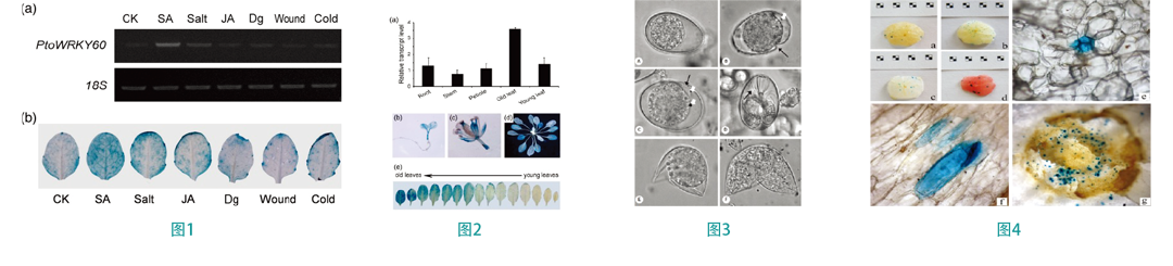 1、YE S, JIANG Y等人利用基因槍系統(tǒng)通過(guò)提高楊樹(shù)轉(zhuǎn)錄因子PtoWRKY60組成型表達(dá)提高楊樹(shù)對(duì)潰瘍病菌SACC的抗性研究結(jié)果。 【圖1、2】