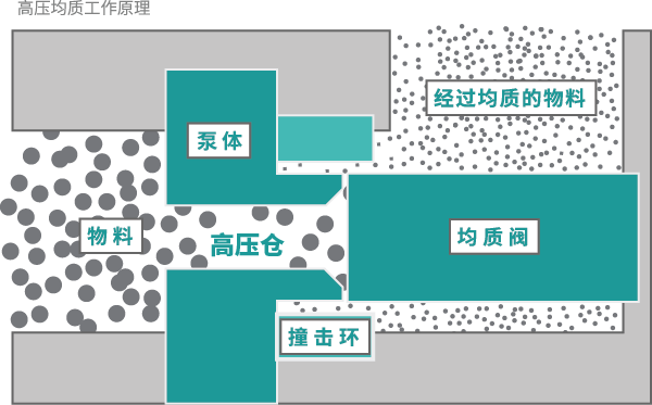 物料由物料杯經(jīng)單向閥進入高壓倉,通過泵體伸縮加壓使樣品達到所調(diào)節(jié)控制的高壓下,通過特定寬度的限流縫隙瞬間釋放形成微射流撞擊沖擊閥或均質(zhì)閥上,依次經(jīng)過空穴、撞擊、剪切的作用來達到物料的乳化分散和細胞粉碎機的目的。