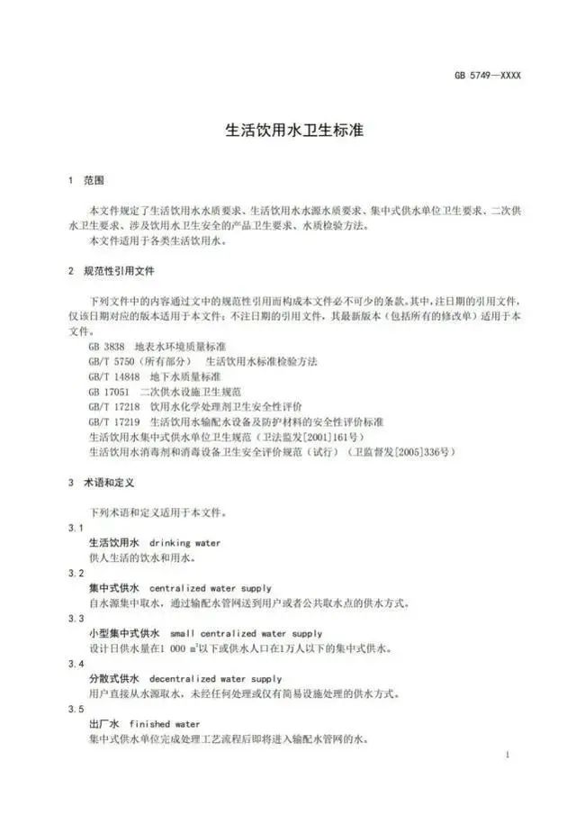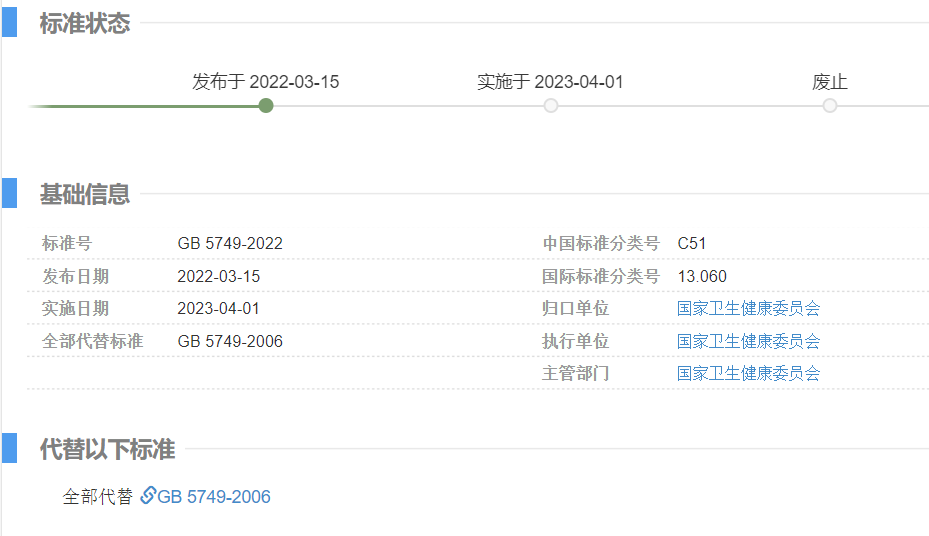 其中《生活飲用水衛(wèi)生標(biāo)準(zhǔn)》(GB 5749-2022)由國(guó)家衛(wèi)生健康委員會(huì)歸口上報(bào)及執(zhí)行,主管部門(mén)為國(guó)家衛(wèi)生健康委員會(huì),將全部代替現(xiàn)行的 GB5749-2006,于 2023年4月1日 開(kāi)始實(shí)施。目前,全國(guó)標(biāo)準(zhǔn)信息公共服務(wù)平臺(tái)暫未正式發(fā)布標(biāo)準(zhǔn)全文,預(yù)計(jì)于4月上旬公布(發(fā)布后20個(gè)工作日內(nèi))。