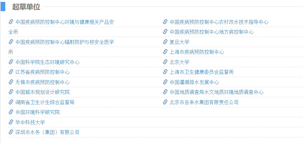 GB 5749-2006起草單位主要為中國(guó)疾病預(yù)防控制中心環(huán)境與健康相關(guān)產(chǎn)品安全所、浙江省衛(wèi)生監(jiān)督所、廣東省衛(wèi)生監(jiān)督所等。