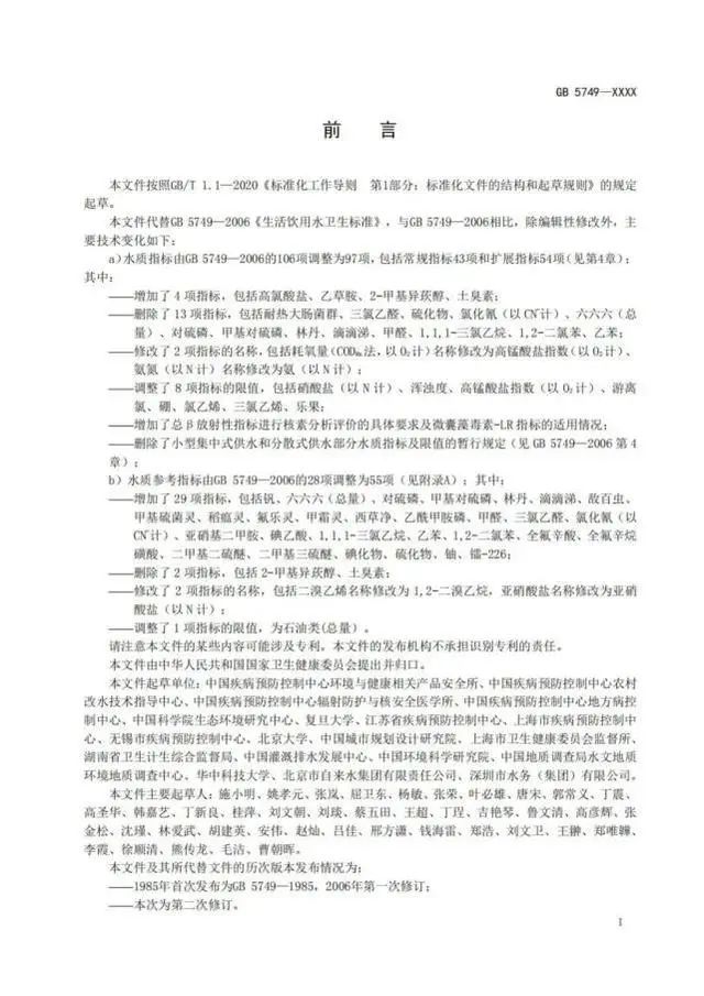 而 GB 5749-2022 標(biāo)準(zhǔn)的起草單位在原有中國(guó)疾病預(yù)防控制中心環(huán)境與健康相關(guān)產(chǎn)品安全所的基礎(chǔ)上新增了18加專(zhuān)業(yè)單位,這也就意味著標(biāo)準(zhǔn)內(nèi)容的制定更加全面、更加嚴(yán)格、更加權(quán)威。