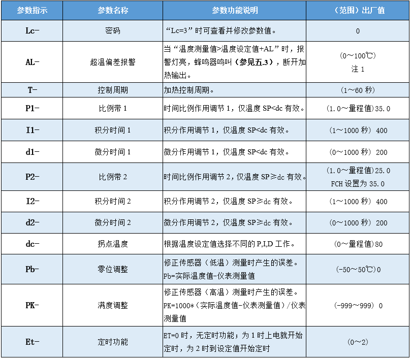 再點(diǎn)擊設(shè)定鍵,若密碼值不正確,控制器自動返回到正常顯示狀態(tài),若密碼值正確,則進(jìn)入到溫度內(nèi)部參數(shù)設(shè)定狀態(tài),再點(diǎn)擊設(shè)定鍵可以依次修改各個(gè)參數(shù)。