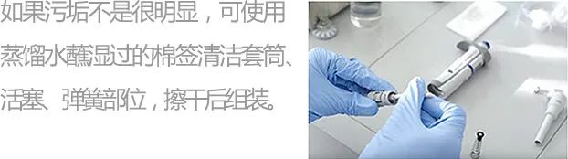 > 先將移液器下半支拆卸,用干凈的紗布或無(wú)塵紙將活塞上原有的潤(rùn)滑油抹去